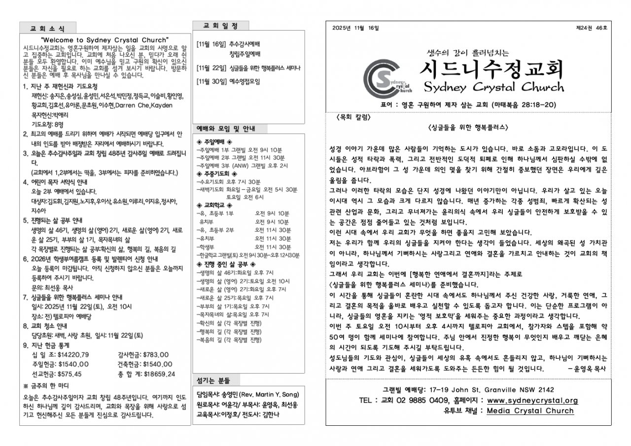 오늘은 추수감사주일이자 교회 창립 48주년입니다. 여기까지 인도하신 하나님께 깊이 감사드리며, 교회와 목장을 위해 사랑으로 섬기고 헌신해주신 모든 분들게 진심으로 감사드립니다.