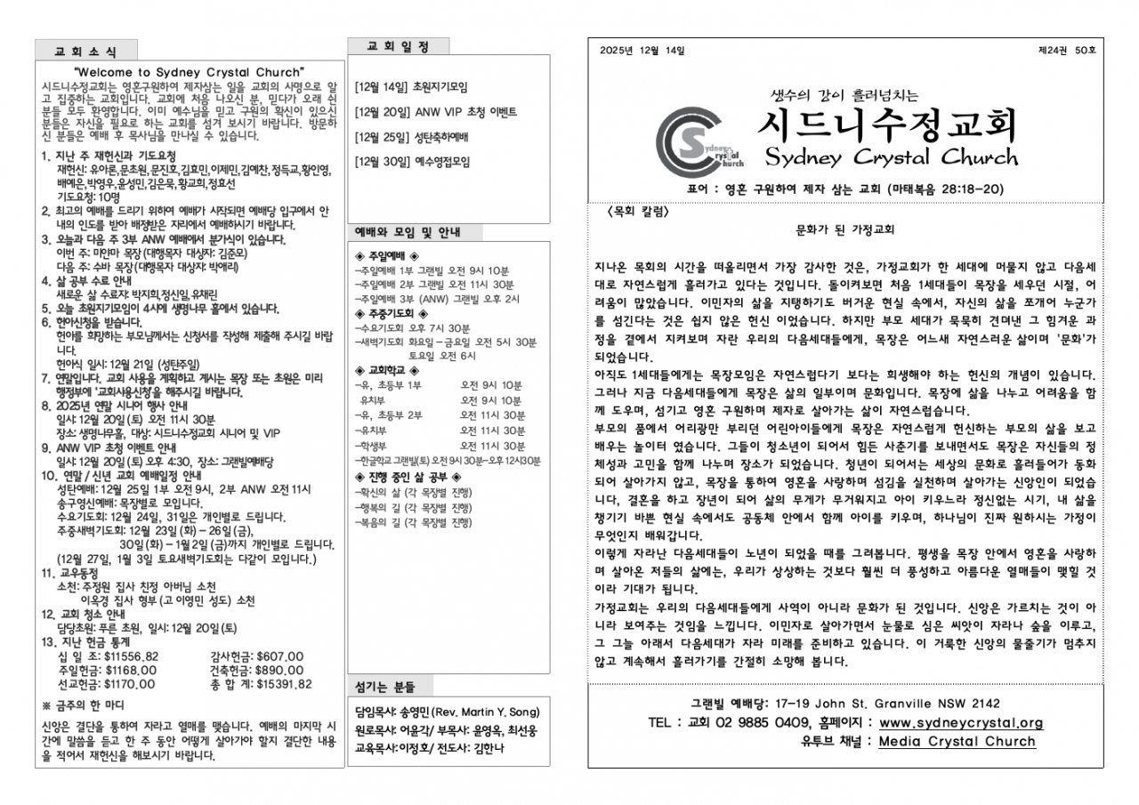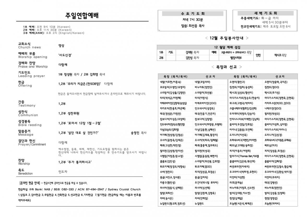 수요기도회:12월 24일, 31일은 개인별로 드립니다.