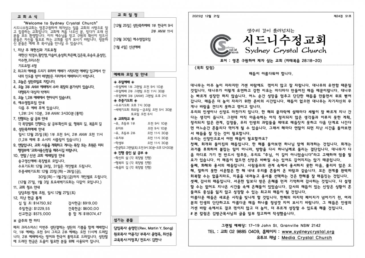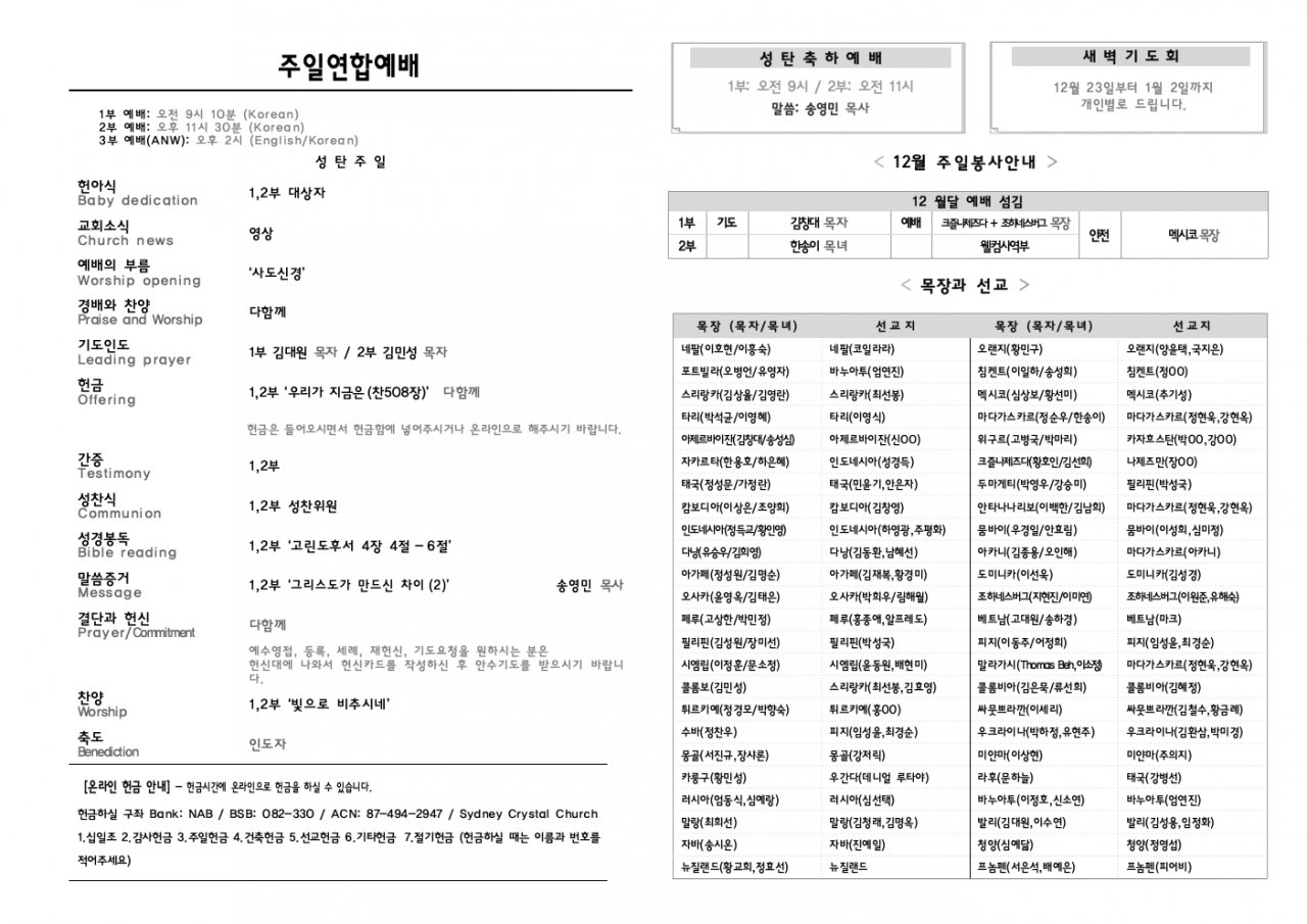 수요기도회:12월 24일, 31일은 개인별로 드립니다.