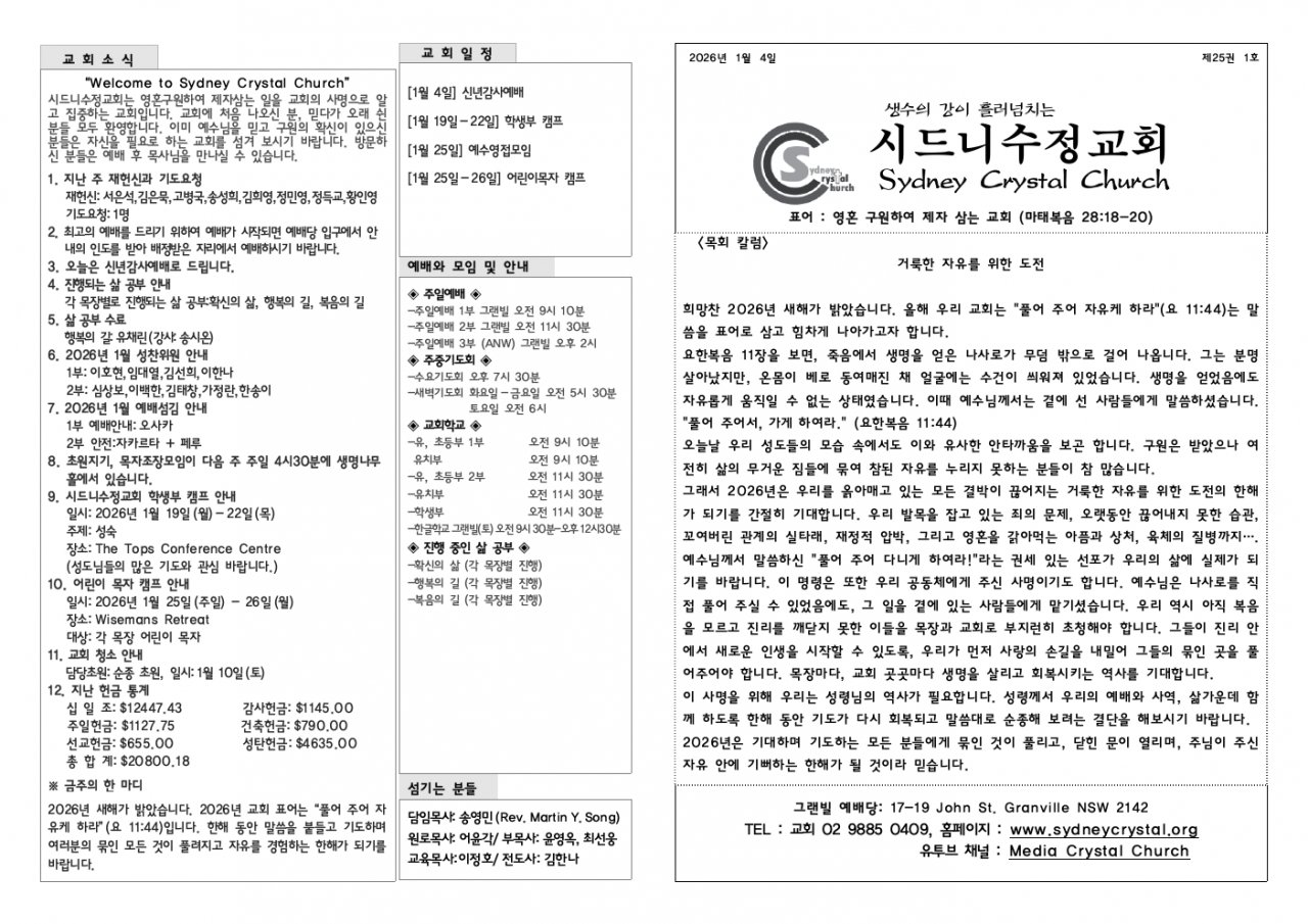 2026년 새해가 밝았습니다. 2026년 교회 표어는 “풀어 주어 자유케 하라”(요 11:44)입니다. 한해 동안 말씀을 붙들고 기도하며 여러분의 묶인 모든 것이 풀려지고 자유를 경험하는 한해가 되기를 바랍니다.